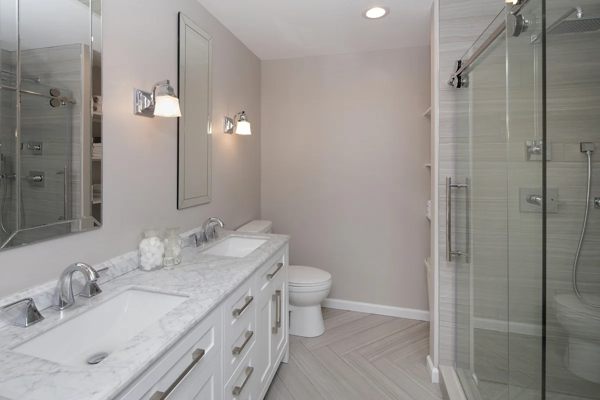 MASTER BATH WITH PORCELAIN HERRINGBONE FLOORS, WALK-IN SHOWER, AND MARBLE TOP DOUBLE-VANITY.