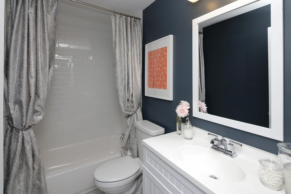 GUEST BATH WITH WHITE SUBWAY TILE AND PENNY ROUND FLOORS.